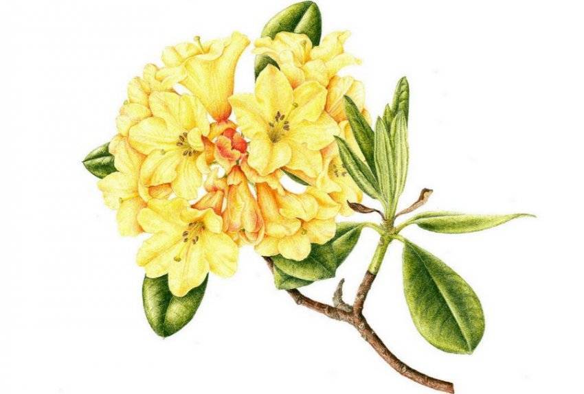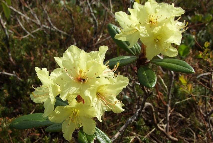Описание растения рододендрон золотистый: семейство Вересковые (Ericaceae). Вечнозелёный кустарник высотой до 60 см со стелющимися приподнимающимися стеблями. Молодые ветви и черешки листьев коротко опушённые. Листья эллиптические, к основанию, слегка завёрнутые, от 2,3 до 8 см в длину и от 1 до 2,5 см в ширину, тёмно-зелёные, блестящие, толстые, кожистые, сетчато-нервные, цельнокрайние. Черешки в 4-5 раз короче листовых пластинок. Цветки на длинных цветоножках, золотисто-жёлтые, 2,5-3 см в длину и до 4-5 см в диаметре, широковоронковые. Венчик почти до половины надрезанный на яйцевидно-округлые лопасти.