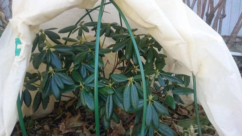 На зиму необходимо также утеплить корневую систему рододендронов – насыпать под куст листья, торф, прикрыть лапником. Полное укрывание проводится путем организации каркаса, поверх которого используют агроволокно и рубероид.