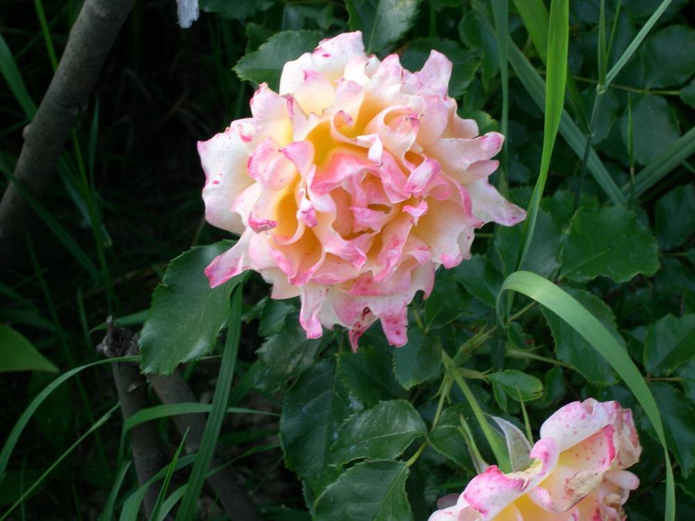 Роза Ламинуэтте Laminuette. Селекция: Lammerts 1969г. Высота: 60-75см. Ширина: 50см. Цветки: махровые 7-8см в диаметре, основной цвет кремово-белый, с бледно-желтым оттенком в центре, края бледно-малиновые. Цветение: повторноцветущая. Устойчивость к заболеваниям: мучнистая роса: , черная пятнистость: . Особенности: цветки медленно распускаются, и держат красивую форму на всех стадиях роспуска.