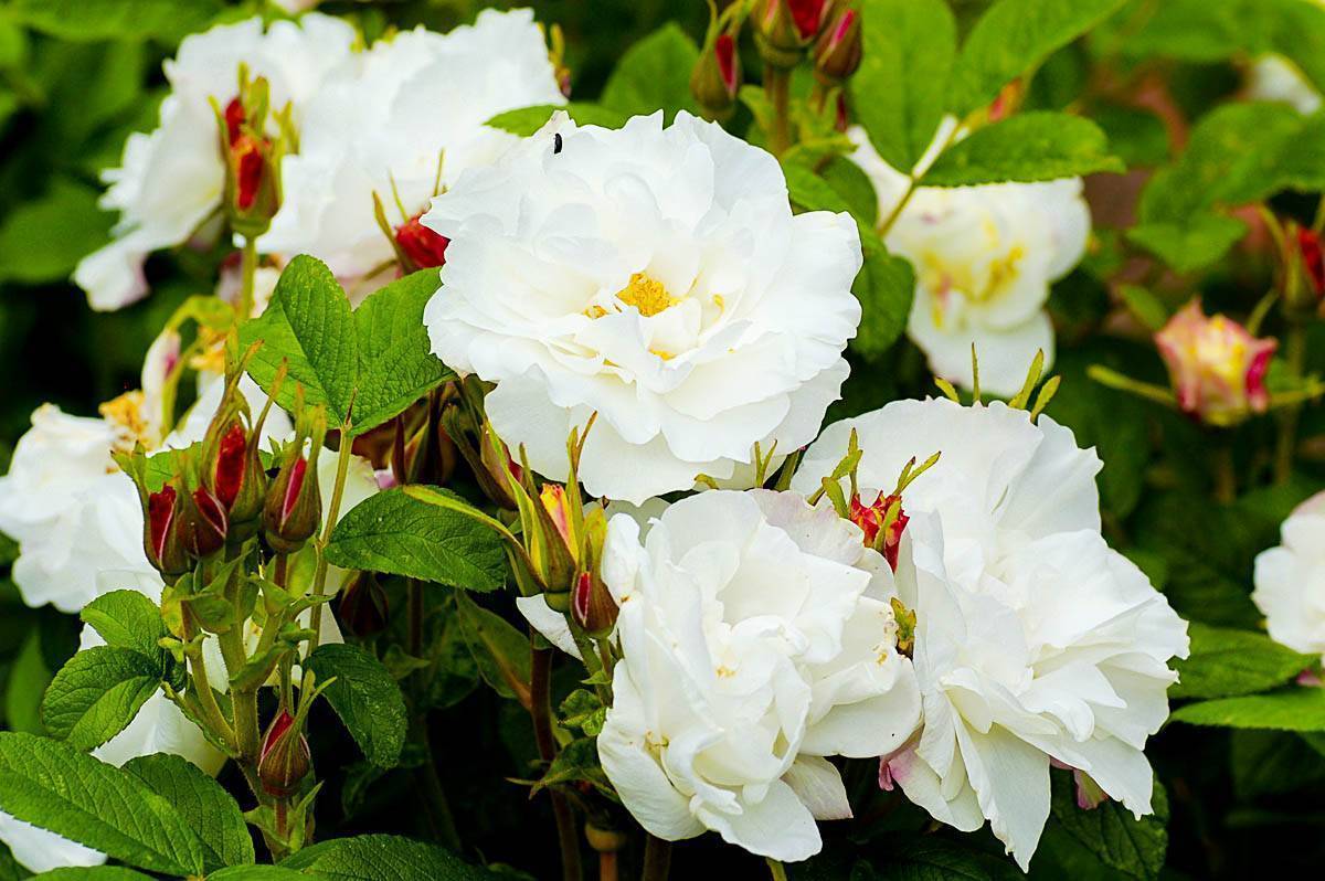 - Интересное происходит цветение розы. Вначале образуются ярко-вишневые бутоны, из них появляются белые лепестки с лёгким зеленоватым отливом, иногда на краях остаётся бордовая кайма. Как все гибриды розы ругоза, «Луиза Багнет» недолго удерживает на стеблях распустившиеся цветки. Они раскрыты день, два, а потом все лепестки облетают. Зато, цветки сменяют друг друга с завидным постоянством. Поэтому куст почти все лето, в цвету.