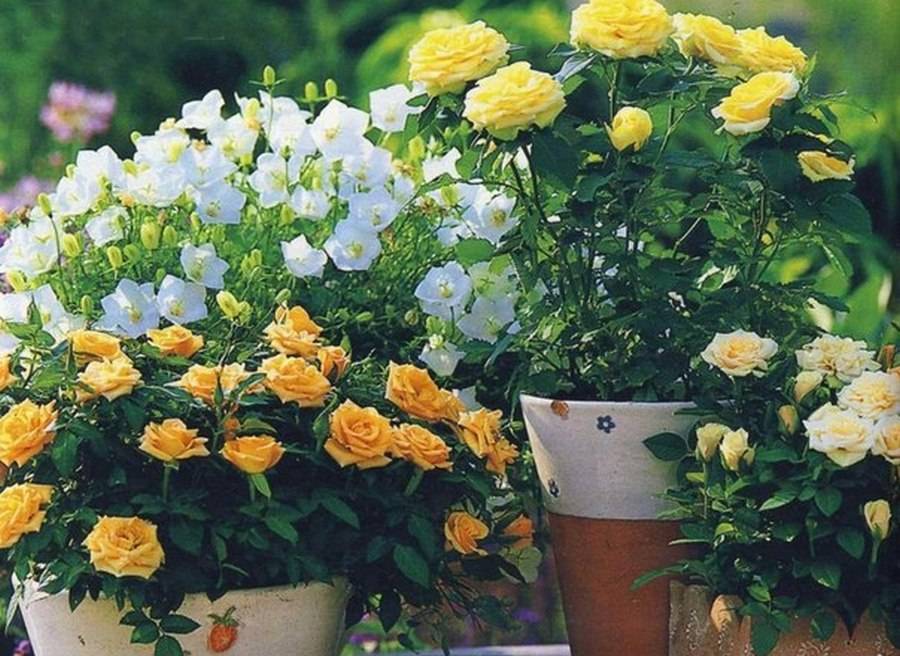 Сказочно красиво выглядят розы, высаженные в больших горшках.