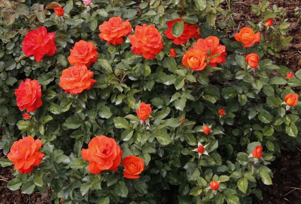 Оранжевые розы довольно популярны среди садоводов. Яркая, огненная окраска цветков на фоне зеленой листвы выглядит эффектно.