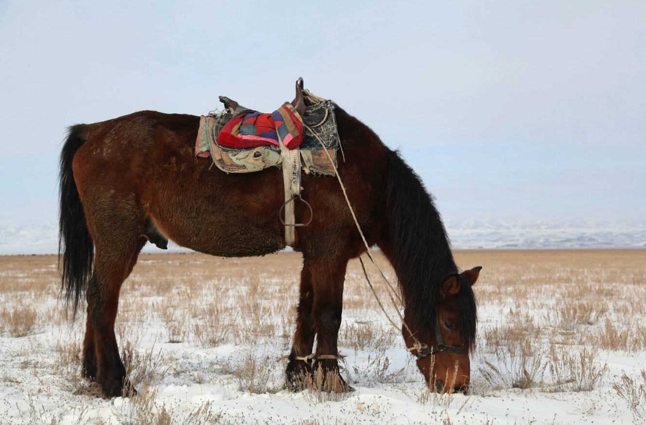 Степные казахские лошади обычно содержатся в табуне, а табун круглогодично находится на выпасе – поэтому специально их кормить не нужно, они сами в состоянии отыскать для себя под снегом траву.