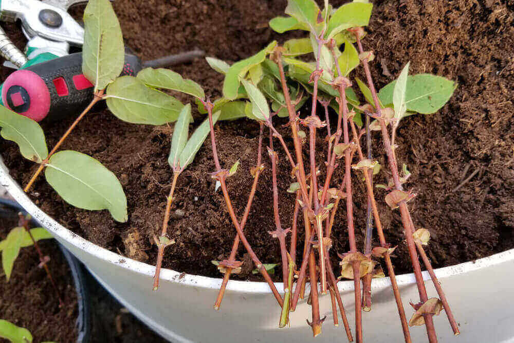 Это побеги, которые уже покрылись корой. Такие черенки берут, начиная с конца июня: срезают верхушки полуодревесневших побегов текущего года и нарезают их на черенки с двумя междоузлиями. Нижние листья удаляют. Черенки опудривают стимулятором корнеобразования и высаживают в горшки в смесь торфа и песка в равных количествах. Через 2–3 месяца на них образуются корни.