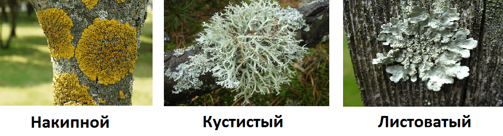 Помните, что никаких ветвей и листьев, а тем более корей, у лишайников нет. Их «тело» еще называют «талломом»– это такое тело, в котором нельзя выделить части, как у растений. В общем, лишайник – это только гриб + водоросль. И всё тут.