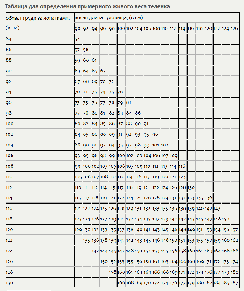 Таблица веса КРС применяется следующим образом. В зависимости от косой длины туловища, выбирают столбец, строка определяется величиной обхвата.