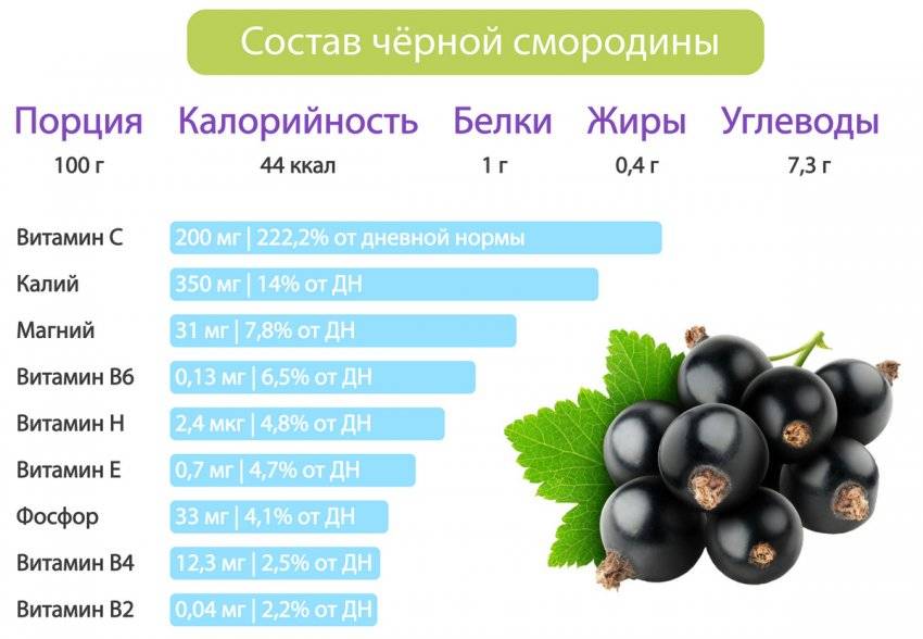 Ягоды чёрной смородины имеют в своём составе большое количество каротина, витаминов А, С, В, Р, а также пектин, сахар, фосфорную кислоту и эфирное масло.