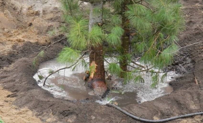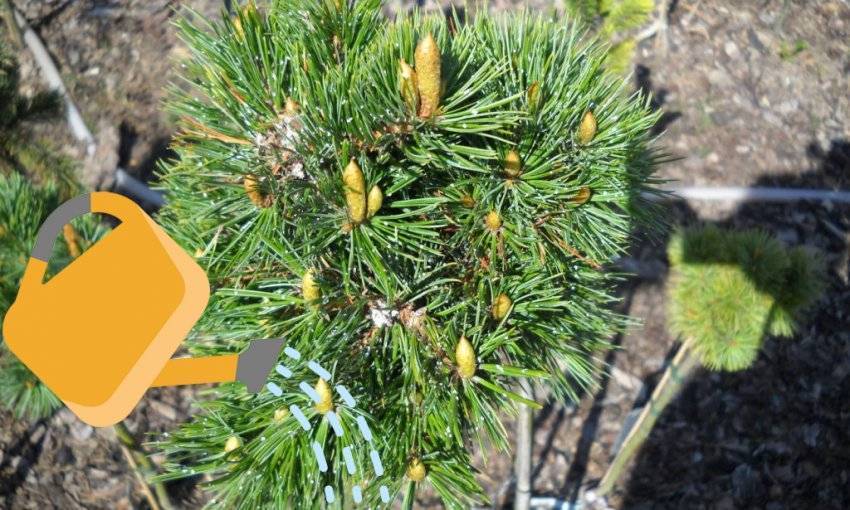 - в первые 2 года после посадки сосну орошают 2-3 раза в месяц, а во время засухи ещё чаще (почва не должна полностью пересыхать);