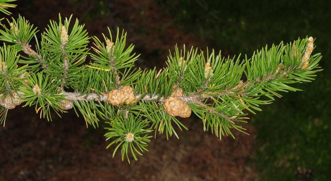 - Ветки густо покрыты иголками, расположенными пучками по 2 шт., а каждая из них имеет скрученную форму и достигает длины 2–4 см.
