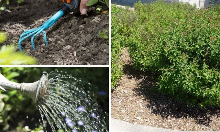 Уход для спиреи требуется минимальный. Ей нужны регулярные увлажнения, внесения удобрений, рыхления, мульчирования, прополки. Чтобы посадки выглядели аккуратно, их необходимо обрезать