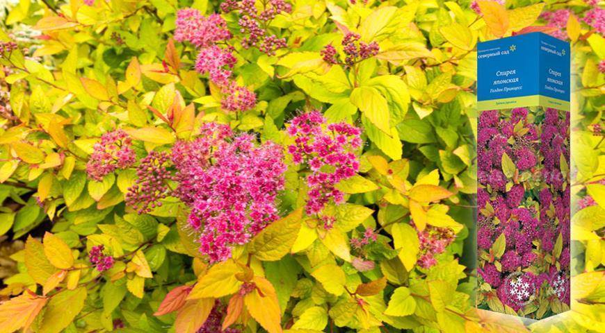 Goldflame – листва различных оттенков в течении сезона: оранжево-красная весной, разных оттенков желтого летом и медно-оранжевая осенью. Сами цветки темно-розовые.