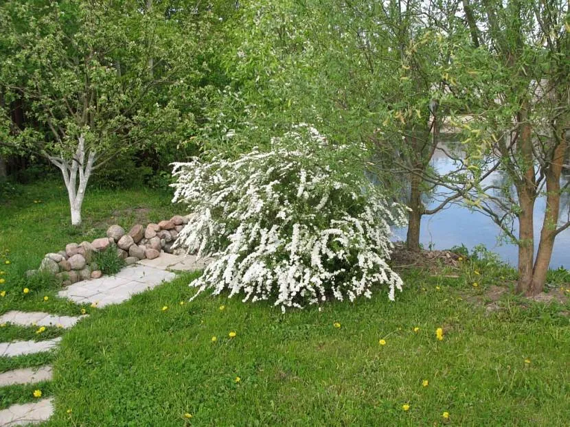 - При посадке одиночными кустами, благодаря раскидистой кроне и россыпи белых цветущих ветвей, спирея сама по себе создаёт законченную лаконичную композицию.