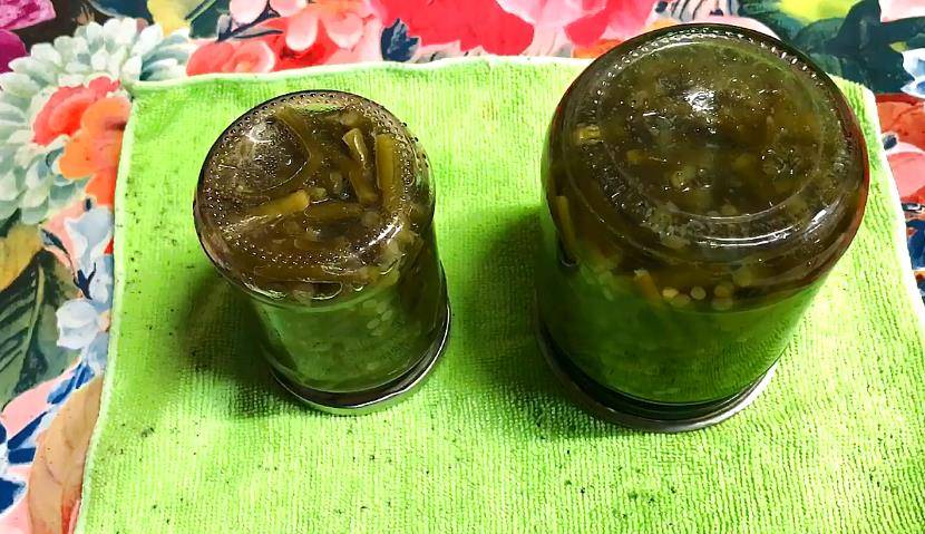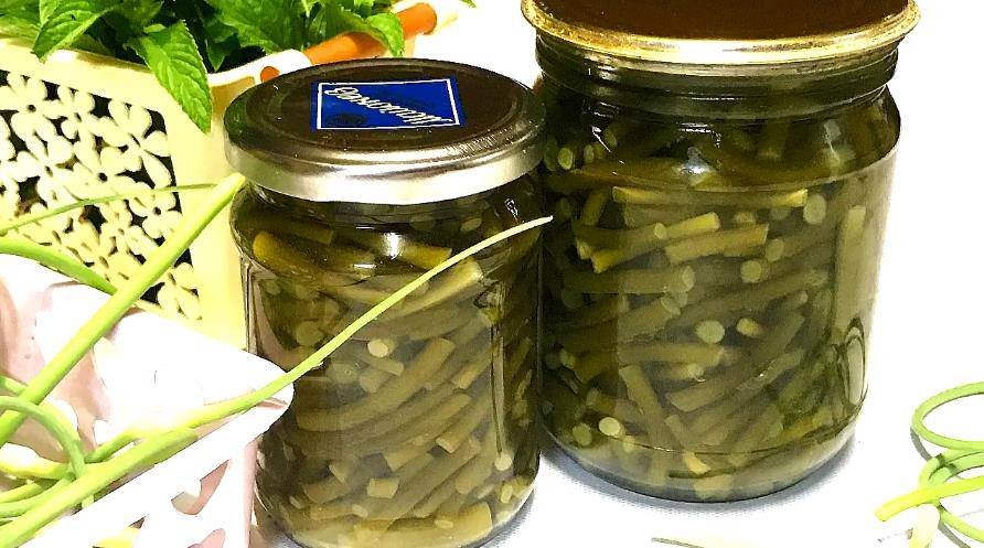 В конце варки влить в маринад уксусную кислоту, растительное масло, дать ему закипеть. Распределить стрелки с маринадом по стерилизованным банкам, закатать подготовленными крышками. Перевернуть, накрыть полотенцем и дать полностью остыть.