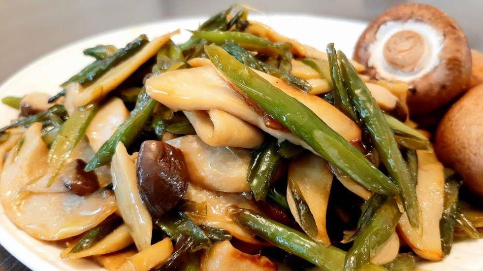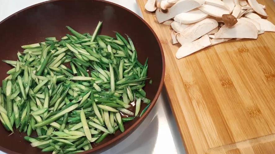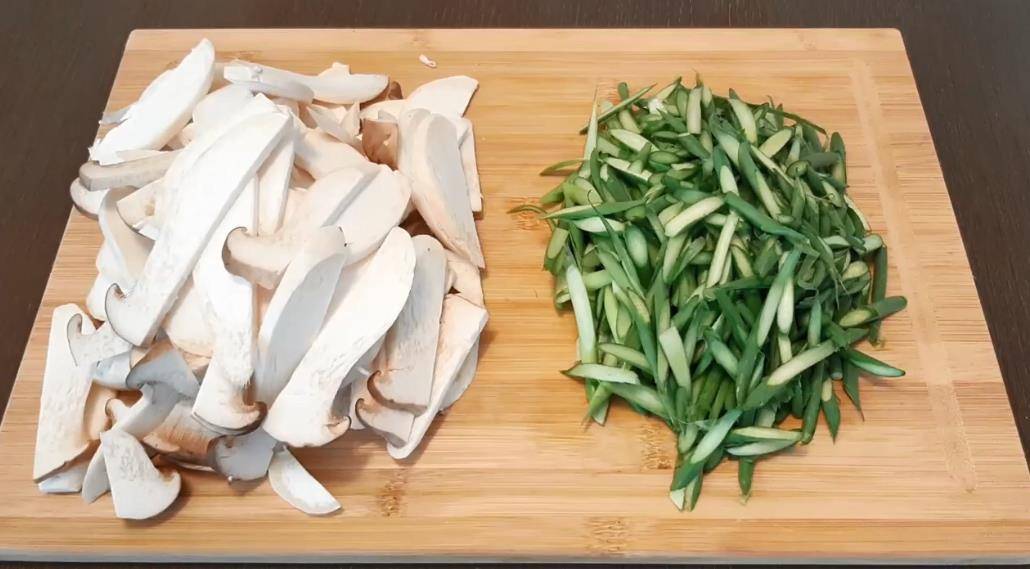 Грибы нашинковать тонкими пластинами. Чесночные стрелки нарезать тонкими косыми кусочками.