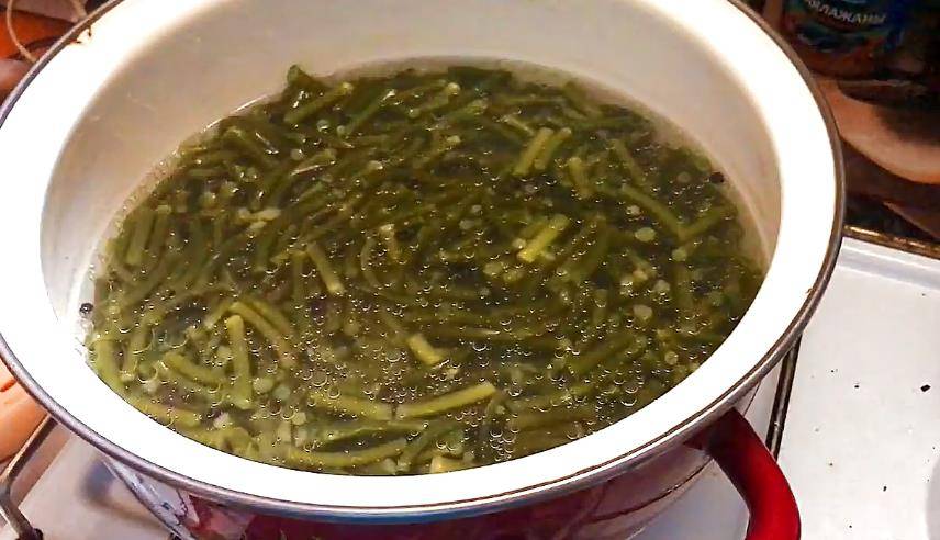 Залить чесночные побеги водой, проварить на среднем огне в течение 35 минут. Добавить в нее черный перец, соль, сахар и перемешать до однородности.