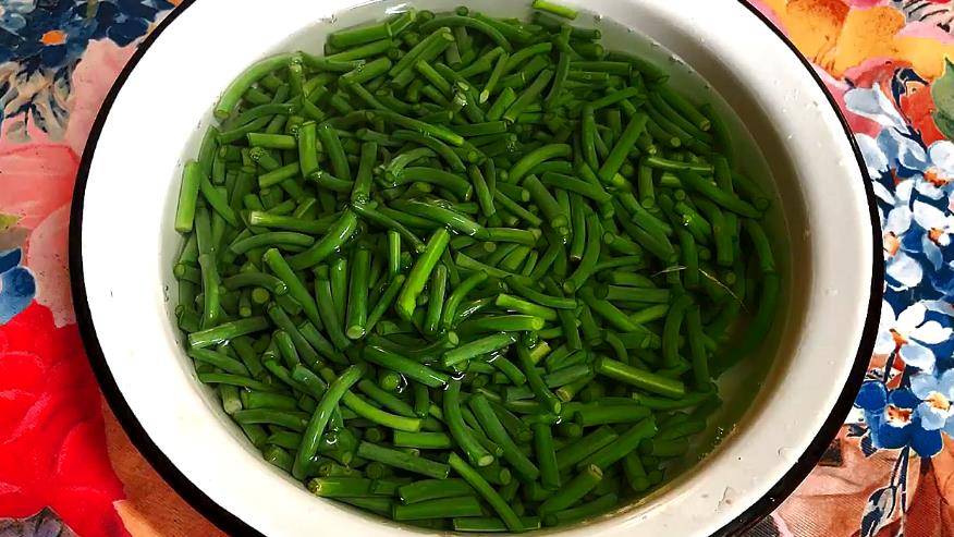 - Чесночные побеги вымыть, откинуть на сито, дать стечь воде. Удалить верхнюю белую часть с кисточкой.