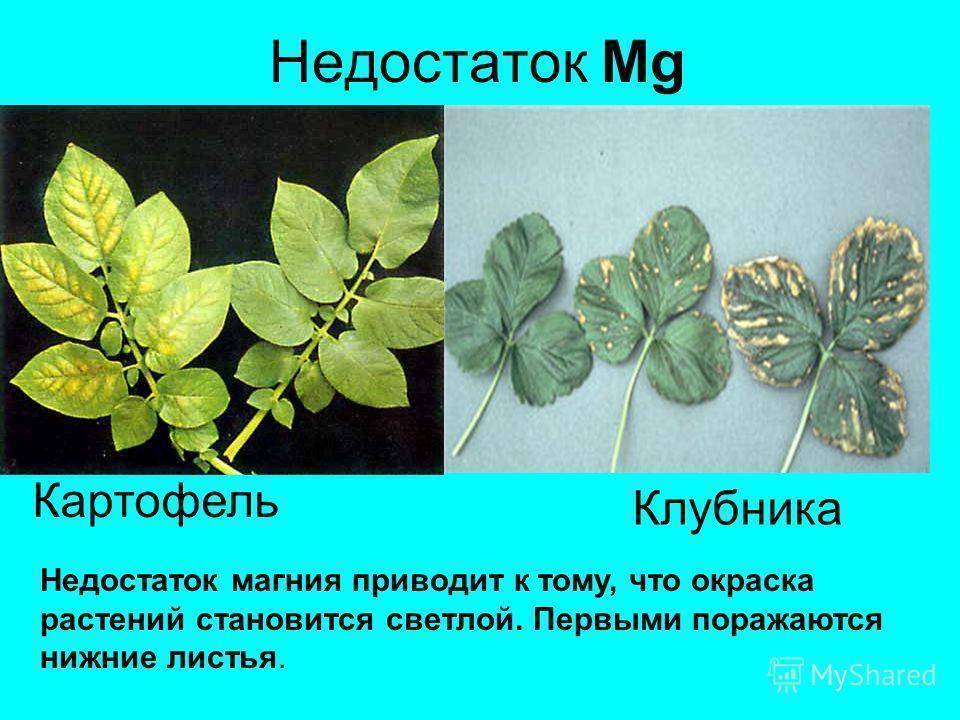 | Картофель | Первый признак дефицита магния у картофеля – отсутствие нижнего яруса листьев на стеблях. Но это уже крайняя степень нехватки элемента. Первичные признаки – резкое пожелтение листьев на нижних ярусах. |