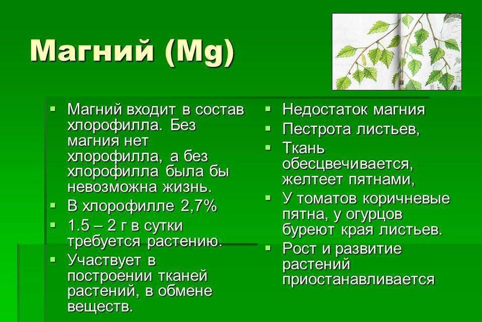 Магний имеет свойство накапливаться в семенах, в состав которых входят пектиновые вещества и фитины. Этот элемент всегда стремится попасть в молодые органы растений, переходя от старых листьев и побегов к новым. После цветения магний начинает скапливаться в зародыше, тем самым обеспечивая быстрый рост и созревание плода. Также магний является катализатором усвоения фосфора и кальция растениями, тем самым обеспечивая нужный приток полезных веществ ко всем органам.