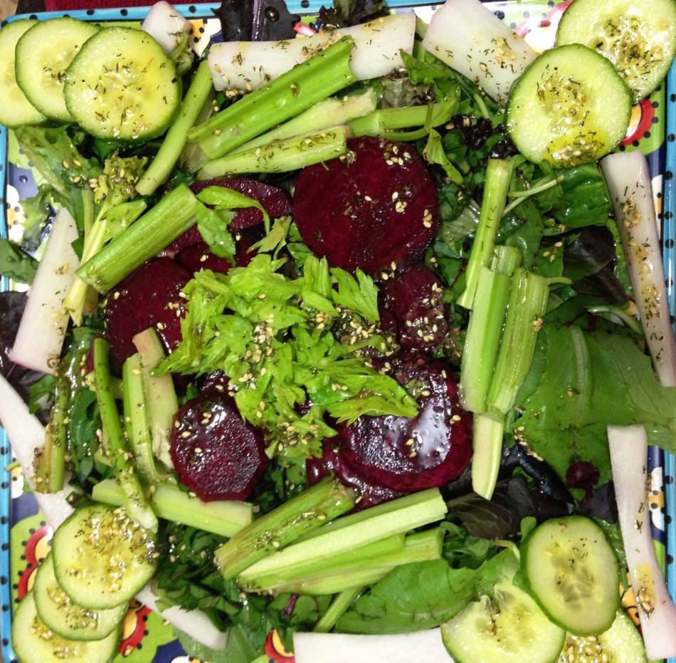 - В тарелке соединяем зелень со свёклой и поливаем заправкой.