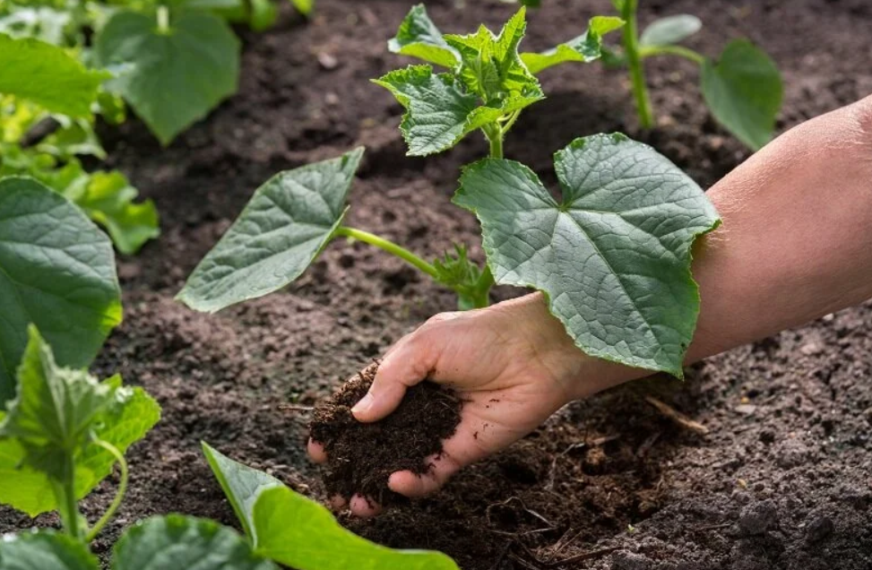 (Грибовчанка, ТСХА 4048, Манул, Мальвина, Заречье, Подмосковные вечера) теневыносливые и пригодны для самых ранних посадок в теплицах. Выращивание при укороченном световом дне позволяет повысить урожайность, ускорить созревание плодов. А вот загущать посадки нельзя. При сокращении жизненного пространства огурцы плохо растут и плодоносят. Дело в том, что у большинства из них женские цветки (с завязями) располагаются на боковых побегах (плетях), а мужские — на основном побеге (стебле). Когда растения в рядках загущены, развивается главным образом стебель с мужскими цветками (пустоцветами), а боковые побеги растут слабо, что отрицательно сказывается на урожае. Растениям огурца нужно много питательных веществ. Ведь за сравнительно небольшой период времени они формируют достаточно высокий урожай плодов. Причем их корневая система, как мы уже говорили, расположена неглубоко, и растения не могут использовать питательные вещества из более глубоких почвенных слоев. Поэтому огурцы следует размещать на высокоплодородных землях, богатых основными элементами питания.Почва на огуречной грядке должна не только быть питательной, но и обладать хорошей воздухопроницаемостью, то есть быть легкой и рыхлой. Причина в том, что семена огурца очень чувствительны к недостатку воздуха, это отрицательно влияет на энергию прорастания и всхожесть. Помогают обеспечить корни кислородом частые рыхления почвы, благодаря которым пополняются его запасы из воздуха.Еще растениям огурца очень нравится повышенное содержание в воздухе углекислоты, которую, разлагаясь, выделяют органические удобрения. Поэтому их внесение улучшает не только корневое, но и воздушное питание растений.