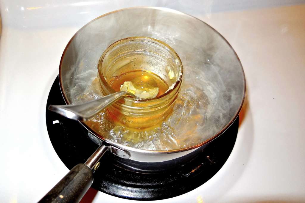 Следующая технология рассчитана для некрупных хозяйств. Вам нужно заблаговременно подобрать качественный и выдержанный в воде материал. Измельчите его, затем поместите в банку из стекла. Саму банку необходимо опустить в кастрюлю с водой и поставить на низкий огонь. Не отходите от плиты — вы должны постоянно помешивать содержимое банки.