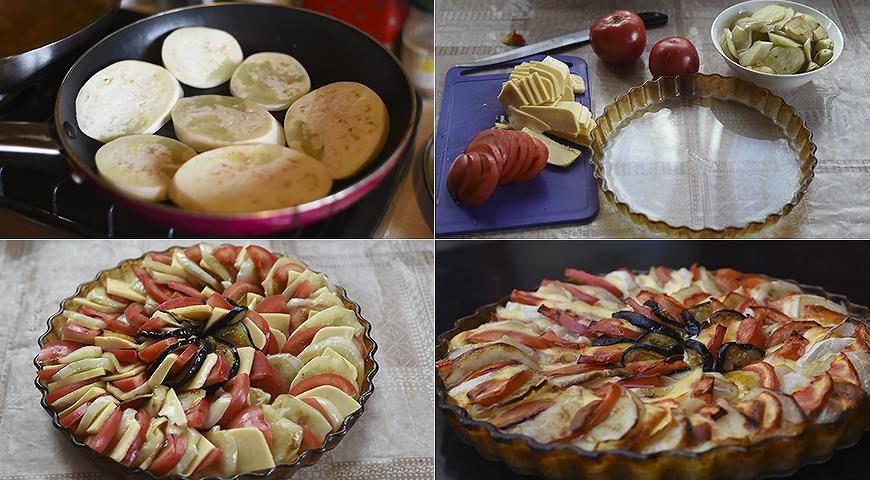 3. Выложите в блюдо все ингредиенты, чередуя баклажаны, томаты и сыр.