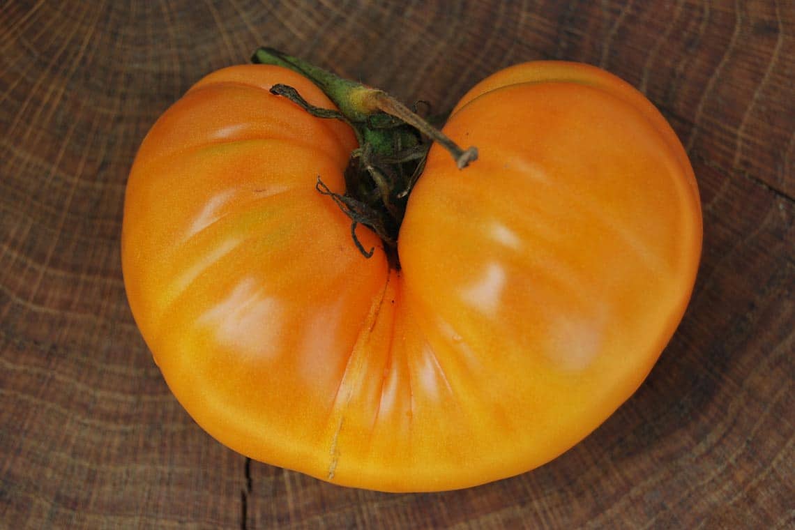 Амана Оранж – большеплодный сорт, который относят к классификации так называемых биф-помидоров. Средняя масса плодов – 400-550 гр. При грамотном подходе вес томатов способен достигать 1 кг. Форма плодов округло-плоская, сильноребристая.