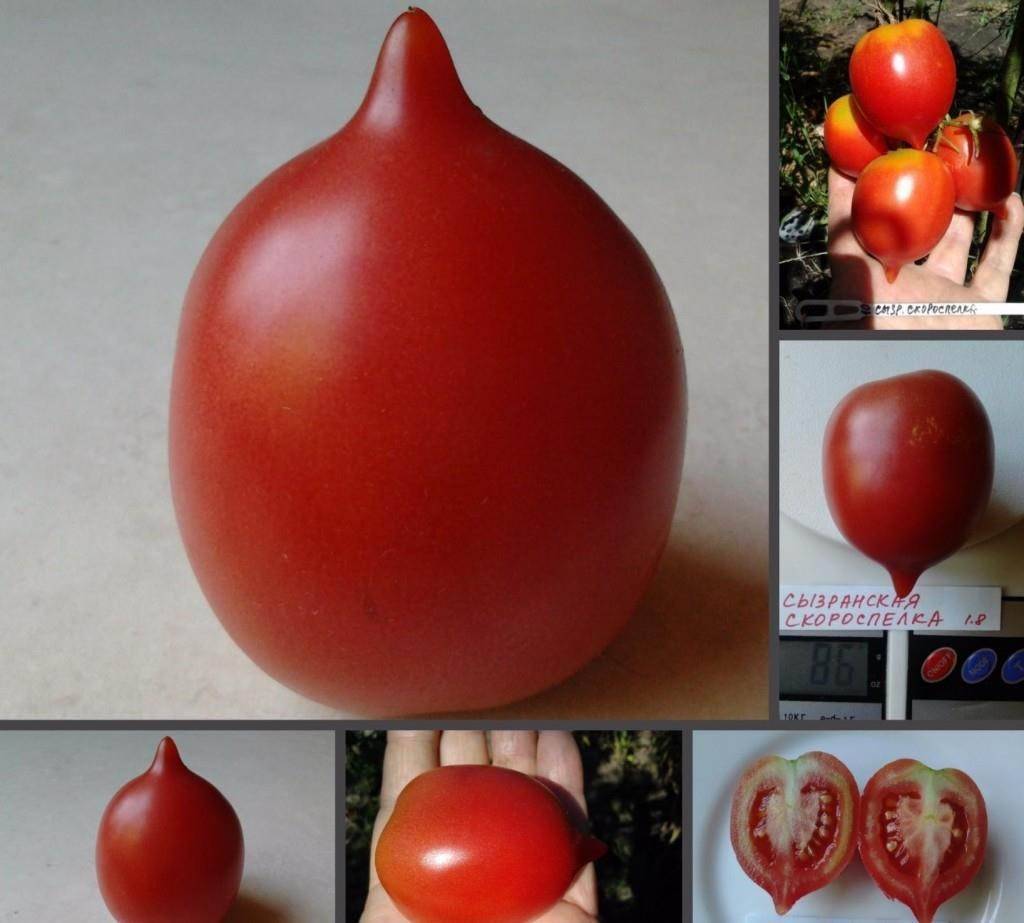 Скороспелка является самой ранней. Этот сорт томата Сызранский — с мощными кустами и длительным плодоношением. Вид относится к полудетерминантному типу – растение достигает 150 см в высоту. Рекомендуется пасынковать, подвязывать к опоре. Предпочтительнее будет формирование в 1-2 стебля. Подходит для выращивания как в теплице, так и на открытом грунте. Сорт представляет собой красивые красные сахаристые плоды сливовидной формы с острым носиком и без кислинки. Вес, в среднем, составляет 100-200 г. Ягоды подходят как для свежей нарезки, так и для консервирования. Отличное преимущество – возможность длительной транспортировки и хранения. При правильном агроуходе урожайность одного куста достигает 3,5 кг.