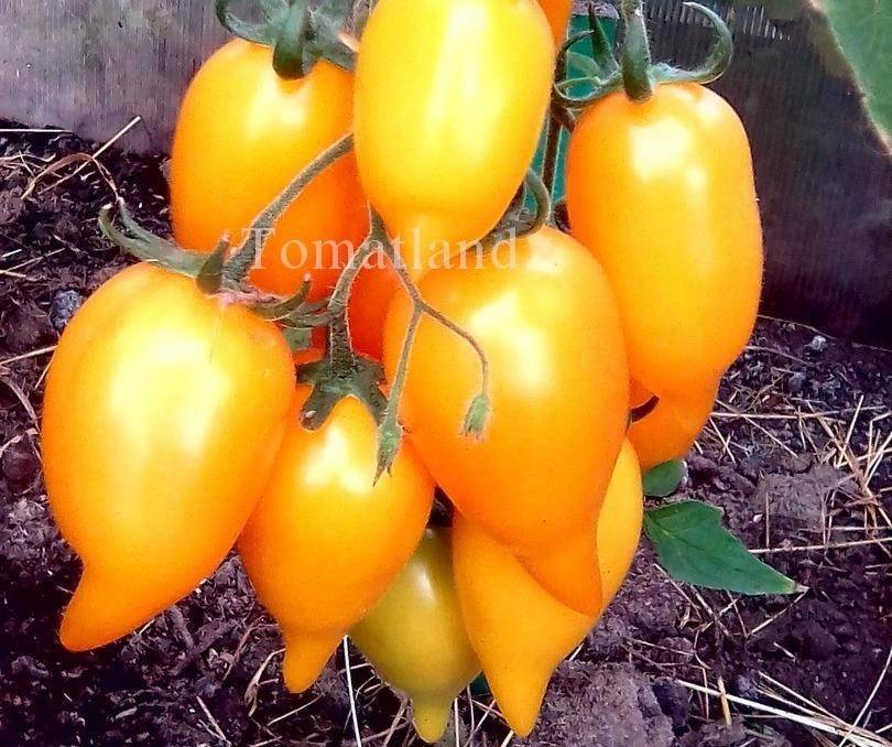Страна выведения сорта — Россия. Форма плодов удлиненно – овальная, с небольшим характерным носиком, с небольшим углублением у плодоножки. Несозревшие томаты зеленые, созревшие насыщенного желто – оранжевого оттенка. Средняя масса 85-100 граммов, при выращивании на защищенных грунтах до 110 граммов.
