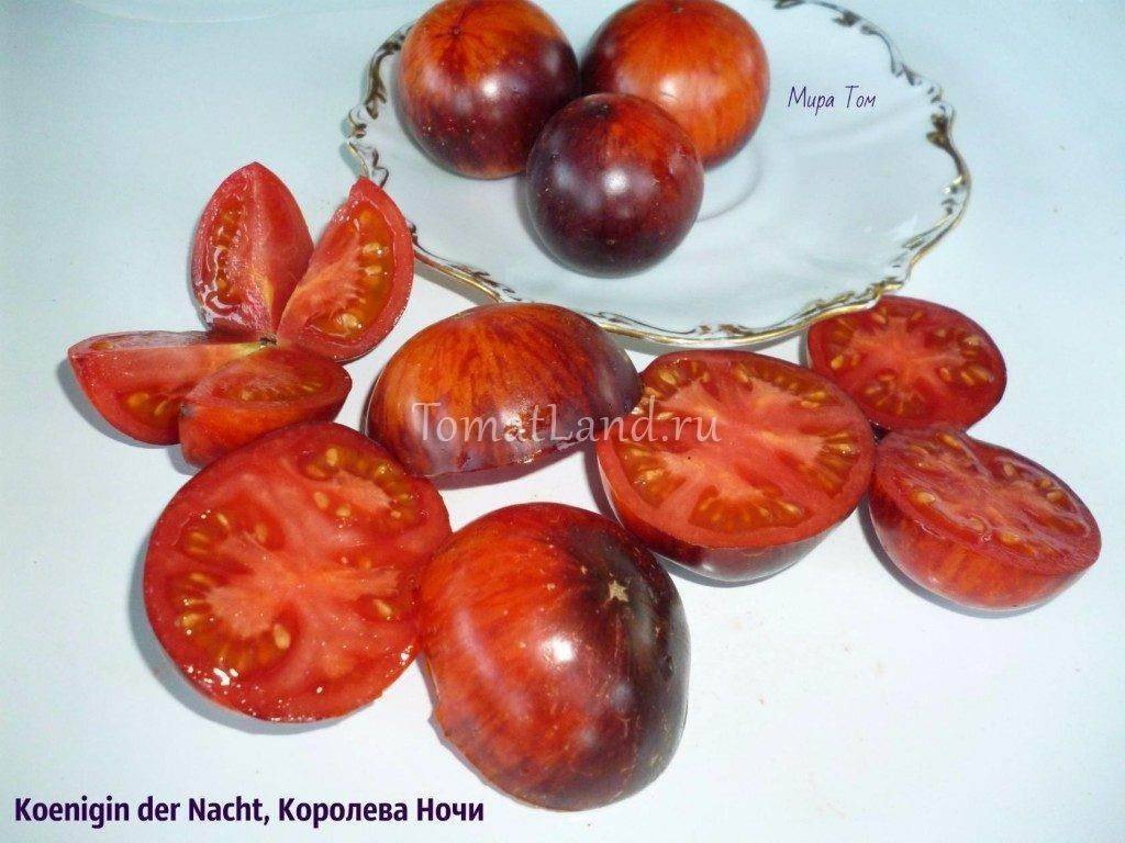 Оригинальное название этого сорта – Koenigin der Nacht. Среднеспелый, среднерослый, экзотический сорт томата для теплиц и открытого грунта. Куст мощный, высотой до 1 метра в открытом грунте, в теплице – чуть выше. Требует подвязки к опоре и пасынкования. Лучшие результаты получились при формирован…