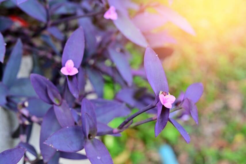 Традесканция бледная пурпурная или сеткреазия — комнатная фиолетовая традесканция с насыщенным цветом стеблей и листьев. Матовые ворсистые листья имеют ланцетно-заостренную форму и в длину достигают 15-17 см. Цветы мелкие с розовым оттенком. Прочные стебли сеткреазии хорошо разветвлены. Используется как почвопокровное или ампельное растение.
