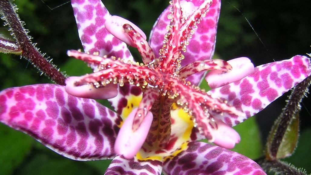 Или трициртис формозский – растение высотой до 80 см с ворсистыми стеблями и овальными блестящими зелеными листьями с темно-красными пятнами. Бело-розовые или розово-сиреневые цветки этого вида исчерчены красновато-коричневым крапом.