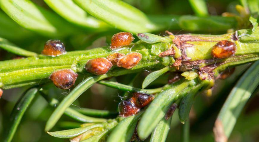 Проводя обработку, необходимо опрыскать не только макушку и внешние ветки дерева, но и все внутренние побеги, а также ствол растения. Защитить тую необходимо от таких болезней, как ржавчина, шютте, фузариоз, корневая гниль, а также от распространенных вредителей: тля, щитовка, ложнощитовка, туевая минирующая моль и моль-пестрянка, пилильщик, листовертка, паутинный клещ.
