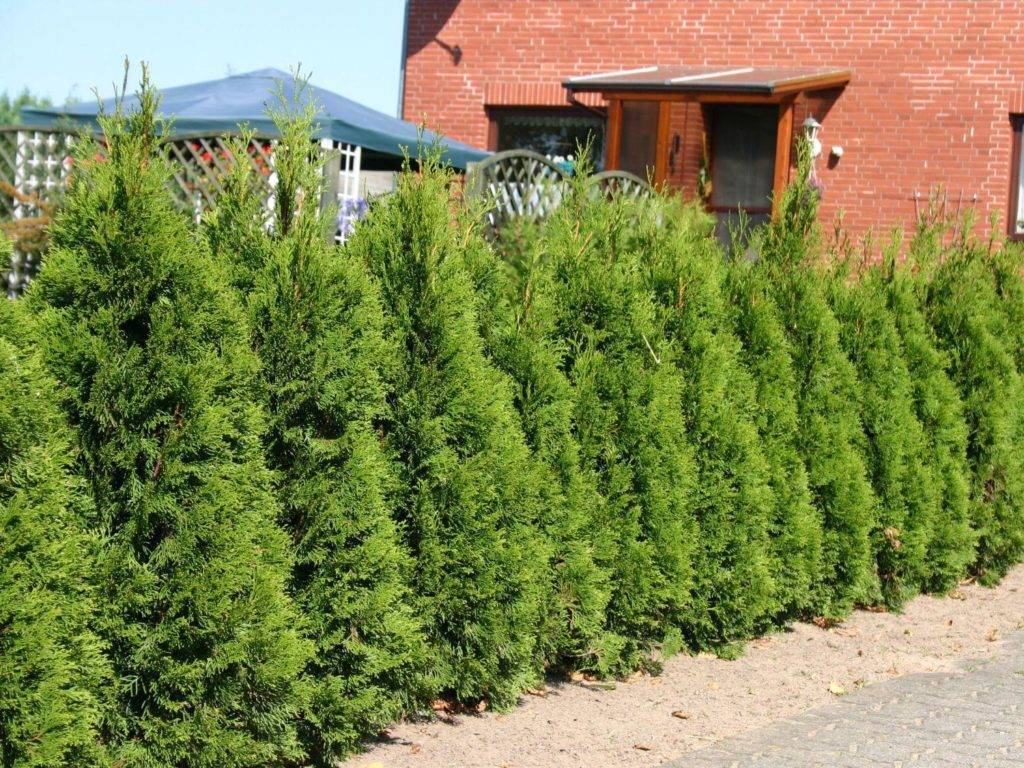 Не стоит забывать, что на рост туи значительно влияет ее периодическая обрезка. Многим дизайнерам может быть не нужны чересчур рослые посадки, поэтому приходится контролировать высоту взрослой туи Смарагд. При создании живой изгороди молодым деревьям, достигшим нужной отметки, просто обрезают верхушку. Так можно настроить дерево лишь на набор объема кроны.