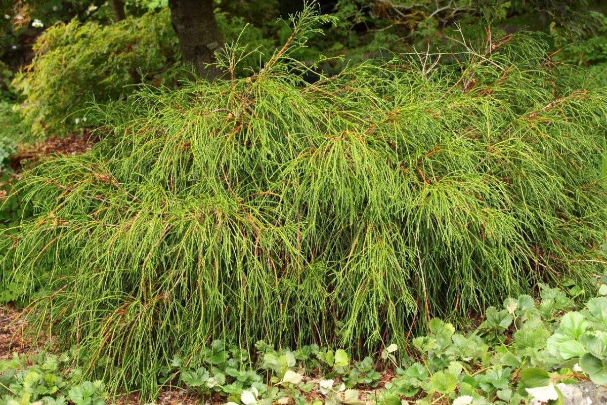 Складчатая туя, любимая многими садоводами за свой необычный внешний вид. Побеги напоминают тонкие проволоки или нитки, свисающие от центра в разные стороны.