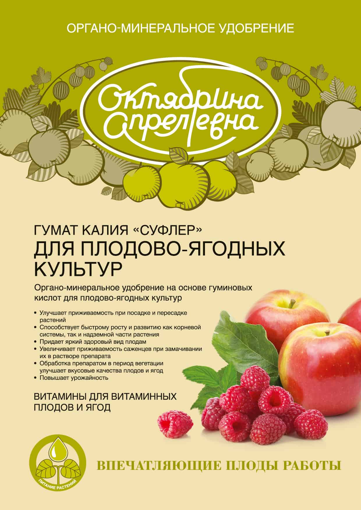- Плодово-ягодные кусты, деревья, саженцы подлежат комплексной обработке гуматом калия, гербицидами, пестицидами. Процедура осуществляется в начале весны до цветения, на момент формирования завязей, в период поспевания урожая. Полив производится с использованием раствора: вода (10 л), препарат (100 мл). Нормы расхода: 7-10 л / 1 м.кв. Опрыскивание выполняется с применением 3 л суспензии на 100 м.кв.
