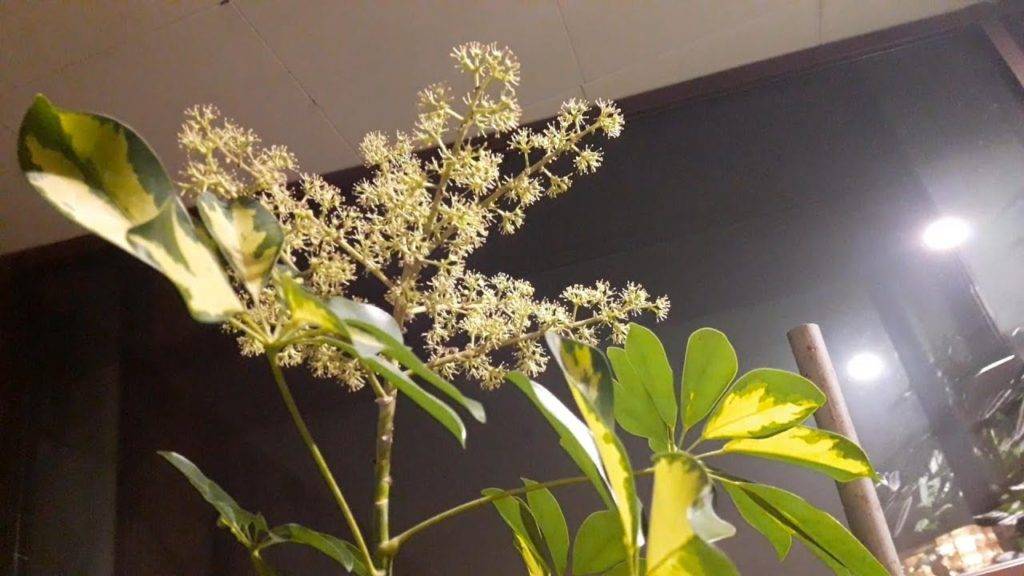 Цветок шефлера теоретически способен зацвести, но в комнатных условиях этого никогда не наблюдается, поэтому все внимание цветоводов при уходе будет направлено на поддержание здорового состояния листвы