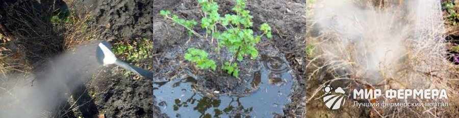Чтобы не нанести вред растениям, не ожечь их молодые листочки и побеги, нужно аккуратно лить раствор в круговую борозду, проделанную по периметру приствольного круга каждого куста.