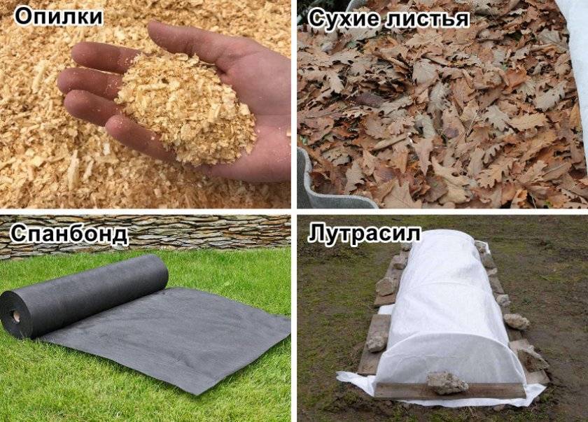 Пространство между растением и металлической сеткой заполняется сухими листьями, каркас оборачивается лутрасилом. Всю конструкцию сверху и со всех сторон следует укрыть водонепроницаемым материалом – рубероидом, полиэтиленом.