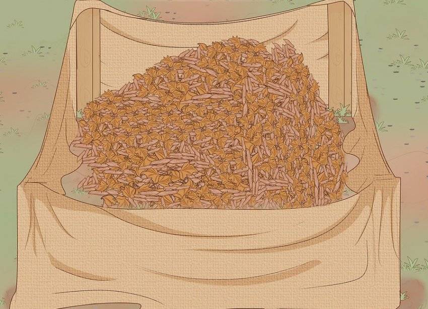 Пространство между растением и металлической сеткой заполняется сухими листьями, каркас оборачивается лутрасилом. Всю конструкцию сверху и со всех сторон следует укрыть водонепроницаемым материалом – рубероидом, полиэтиленом.