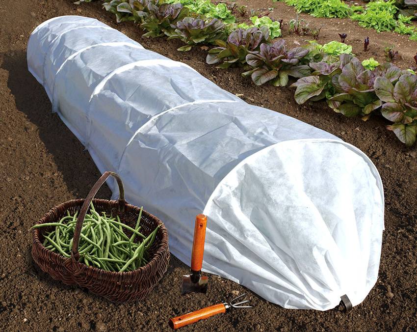 - Волокно 42-60 г/кв.м. отличается большой плотностью. Его используют для защиты растений от легких заморозков. Для этого материал натягивают на стальной или деревянный каркас, который сооружают по грядке.