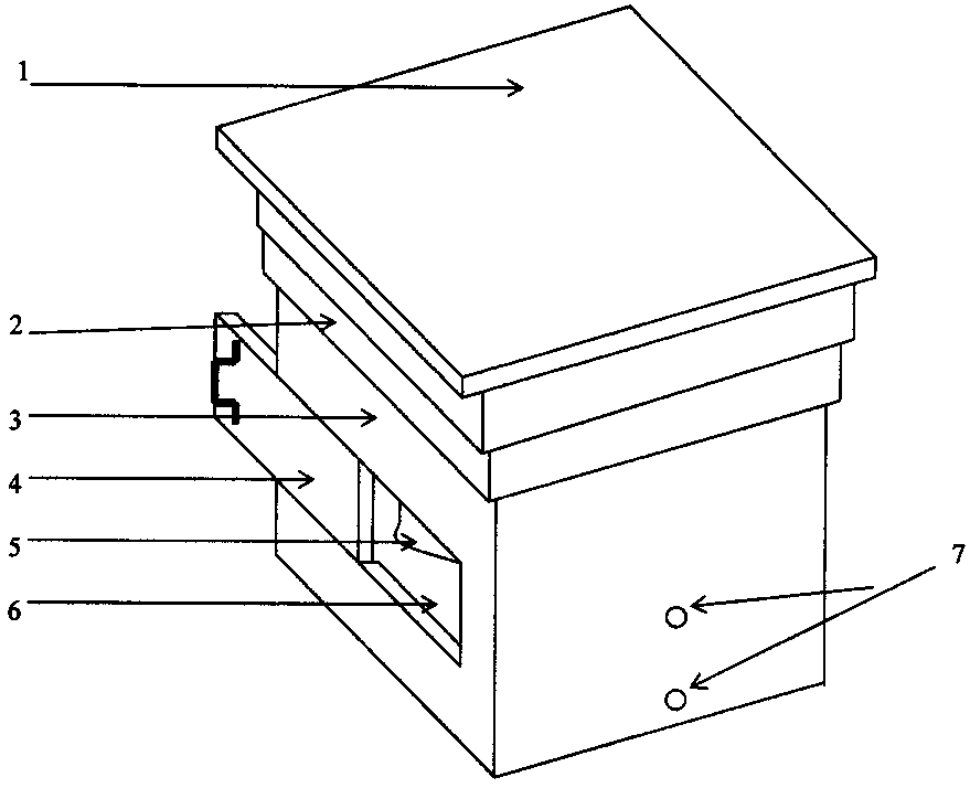 Улей состоит из крышы 1, подкрышника 2, корпуса 3, подвижной задвижки 4, трутневой соты 5, подгнездового пространства 6, летков 7.