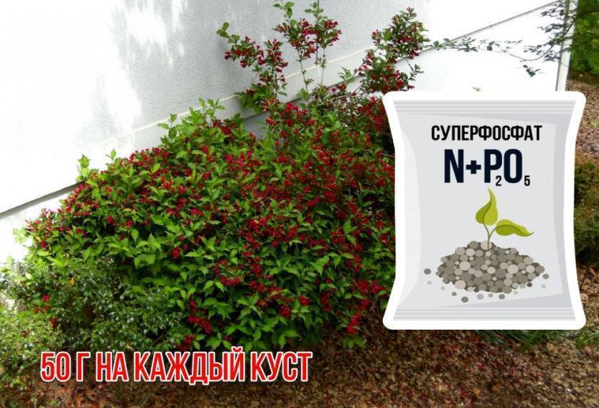 Цветущую вейгелу следует подкармливать нитратом калия (40 г на 1 растение). Через 2 недели после второй подкормки вносят суперфосфат (50 г на каждый кустарник). В середине октября нужно насыпать в приствольный круг древесную золу.