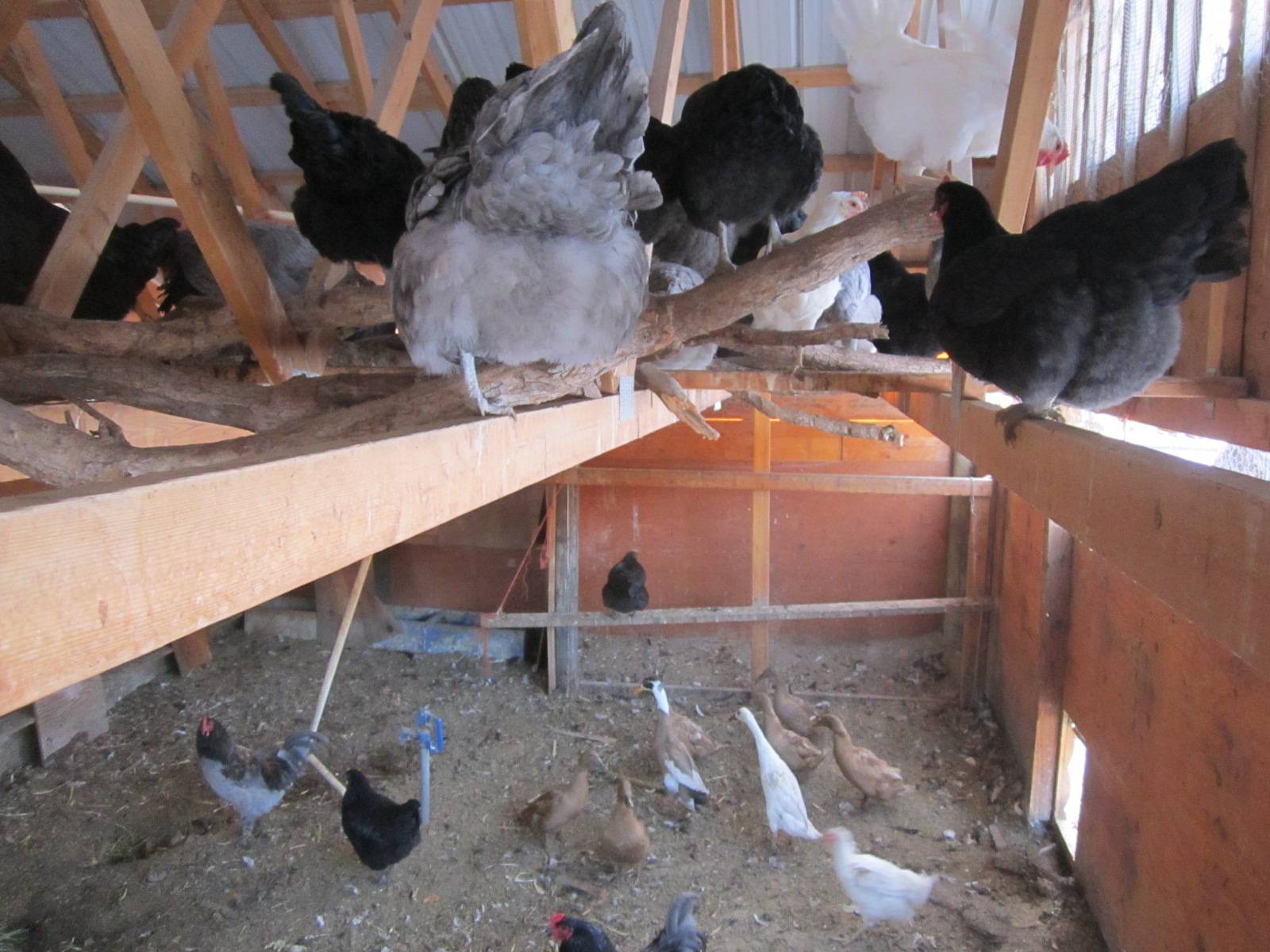 Кроме того, для получения естественного обогрева, когда температура в помещении сарая дополнительно повышается благодаря собственному теплу кур, заботливые хозяева на зиму укладывают на пол глубокую подстилку высотой около 40 см из сухих опилок, листьев, сена и соломы.