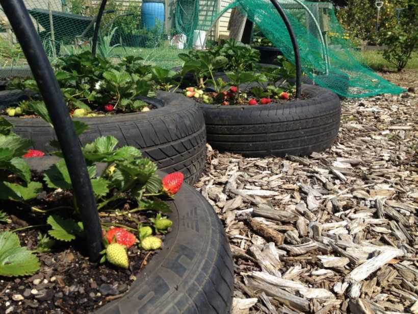 В каждой покрышке с боков проделывают отверстия для кустиков. Внутрь засыпают землю, высаживают клубнику. Такие приспособления можно увидеть на участках многих дачников, но в последнее время огородники отказываются от конструкций из автомобильных шин.