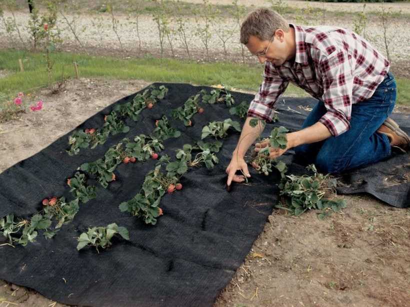 Основное преимущество неорганической мульчи — её долговечность. Мульчирование чёрной плёнкой и агроволокном проводится в период высадки культуры. Разложив материал на грядке, сверху засыпают землю. Затем нужно проделать крестообразный прорез и через него сформировать в грунте лунку, чтобы высадить туда растение. Количество прорезей каждый определяет индивидуально.