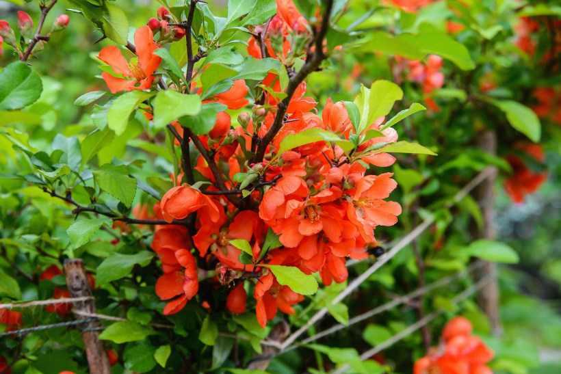 Красив и куст айвы. Айва японская, цветет красными, оранжевыми цветами, позже появляются плоды, напоминающие по вкусу обычную айву. Справедливости ради стоит отметить, что у айва ценится скорее за декоративность, чем за вкус ягод. Этот декоративный кустарник морозостойкий.