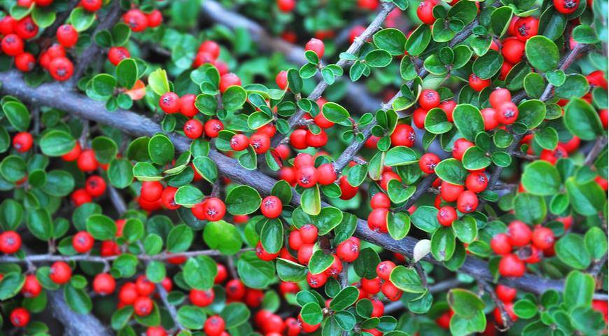 Кизильник горизонтальный – медленнорастущий стелющийся кустарник с горизонтально растущими ветками высотой до 80 см с мелкими темно-зелеными глянцевыми округлыми листьями. Цветет бледно-розовыми цветами, а в середине лета появляются огненно-красные небольшие плоды, которые могут продержаться до следующей весны. Осенняя листва приобретает яркий багровый цвет, что добавляет декоративности саду.