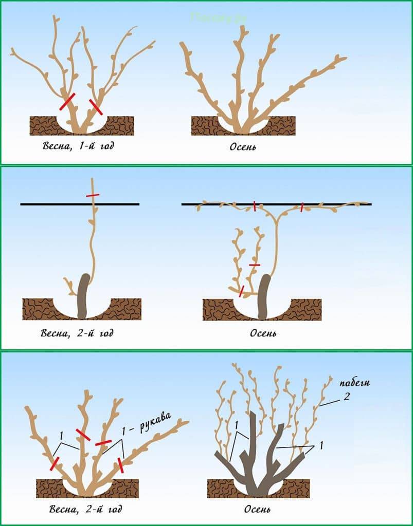 Формирование виноградной лозы начинают на второй год роста и развития растения, оставляя ежегодно по два новых плодовых побега. Все лишние, сухие, поврежденные, пораженные ветки и побеги удаляют.
