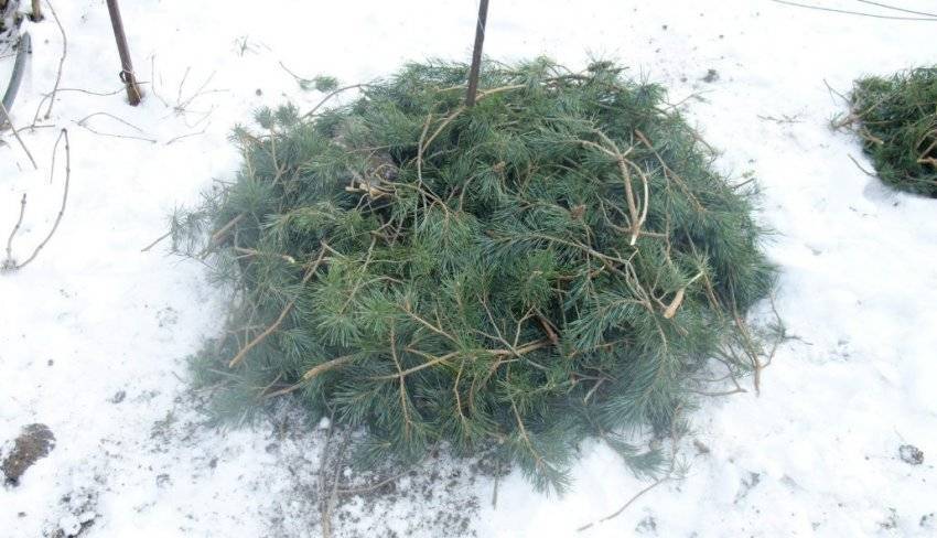 Растения окучивают и мульчируют сухими листьями. Сверху ставят деревянный ящик или металлические дуги, затем натягивают агроволокно. Весной укрытие снимают, чтобы не допустить выпревание винограда.